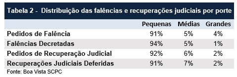 A tabela 2 mostra como estão distribuídas as falências e recuperações judiciais por porte de empresa até junho de 2018 a partir dos critérios de porte de empresa adotados pelo BNDES . As pequenas empresas, por exemplo, são responsáveis por 91% dos pedidos de falências e 92% dos pedidos de recuperação judicial. Com relação as falências decretadas e recuperação judicial decretadas, também houve predominância de ocorrências entre pequenas empresas, sendo de 94% e 91%, respectivamente.