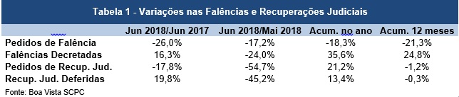 Os pedidos de falência caíram 18,3% no acumulado entre janeiro e junho em relação ao mesmo período de 2017, segundo dados com abrangência nacional da Boa Vista SCPC. Mantida a base de comparação, as falências decretadas e os pedidos de recuperação judicial aumentaram 35,6% e 21,2%, respectivamente. As recuperações judiciais deferidas registraram aumento de 13,4% no mesmo período.