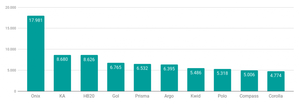 De acordo com o relatório da Fenabrave, em setembro foram emplacados 173.193 automóveis – uma queda de 15,07% em comparação com o mês anterior, quando foram vendidas 203.926 unidades. Desde janeiro, apenas quatro modelos se repetem todos os meses no ranking dos 10 mais emplacados: Chevrolet Onix, Hyundai HB20, Volkswagen Gol e VW Polo.
