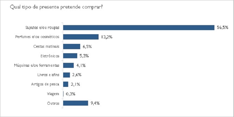 Sapatos e roupas serão as escolhas de 56,5% dos filhos. Para os pais mais vaidosos, 13,2% pretendem comprar um perfume ou cosmético. As cestas matinais correspondem a 6,5% das intenções de compra; os eletrônicos a 5,3%; máquinas ou ferramentas a 4,1%; livros e afins a 2,6%; artigos de pesca, 2,1% e viagens a 0,3%.