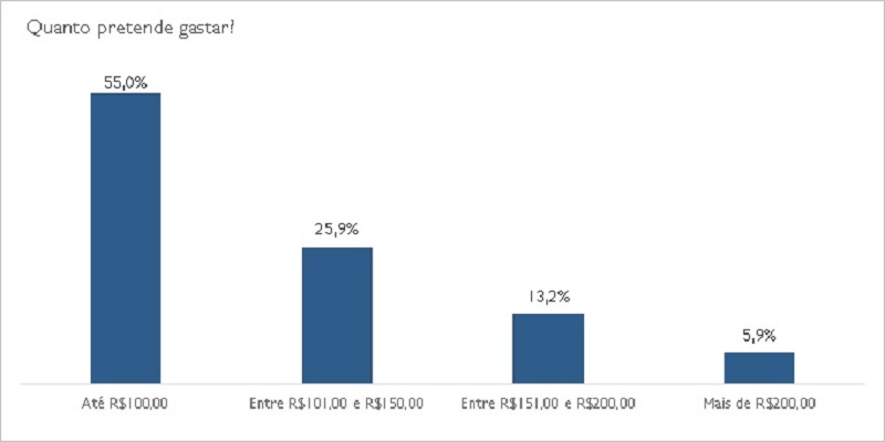 De acordo com a Fecomércio PR, acredita-se que o distanciamento dos últimos meses será compensado com algum tipo de presente, ainda que com valores mais modestos. Os dados mostram que o tíquete médio baixou de R$116,89 em 2019 para R$111,47 este ano, sendo que 55,0% dos entrevistados deverão gastar no máximo R$100,00. Os filhos que planejam gastar entre R$101,00 e R$150,00 somam 25,9%; os que deverão comprar um presente na faixa de R$151,00 e R$200,00 correspondem a 13,2% e os que estão dispostos a gastar mais de R$200,00 são apenas 5,9%.