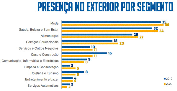 Com relação aos segmentos, Moda historicamente permanece com maior participação do franchising brasileiro no exterior, acompanhado por Saúde, Beleza e Bem-Estar e Alimentação.