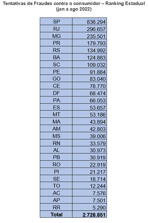 Por estados, São Paulo lidera o ranking, com cerca de 836 mil tentativas no mesmo período. Na sequência aparecem: Rio de Janeiro, com 297 mil; Minas Gerais, com 236 mil; Paraná, com 180 mil e Rio Grande do Sul, com 135 mil. Veja abaixo o ranking por Estados.