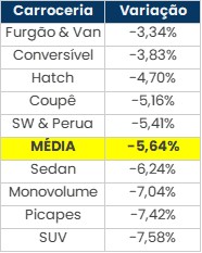 Mobiauto fez um levantamento minucioso de todos os estratos do mercado brasileiro de automóveis seminovos, realizando comparações de todos esses segmentos. Para apurar essa variação de preços, a equipe fez uma média das cotações nos três primeiros meses de 2022 e repetiu a pesquisa no mesmo período deste ano. Na média de todo o mercado nacional, ao considerar seminovos 2020, 2021 e 2022, a depreciação neste período foi de 5,64%. Veja a tabela: