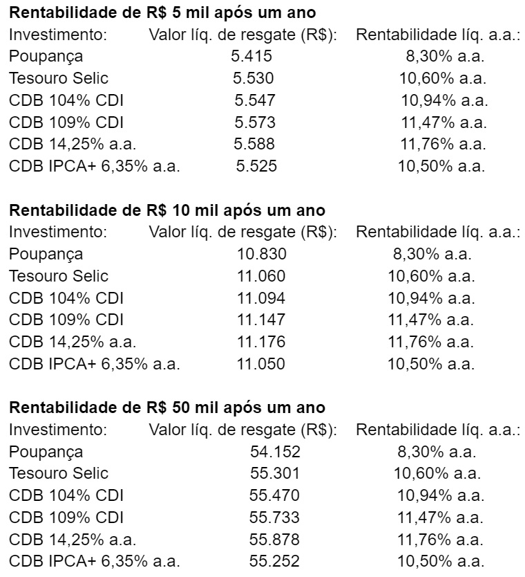 Simulações mostram quanto rendem R$ 5 mil, R$ 10 mil e R$ 50 mil investidos por um ano em diferentes aplicações