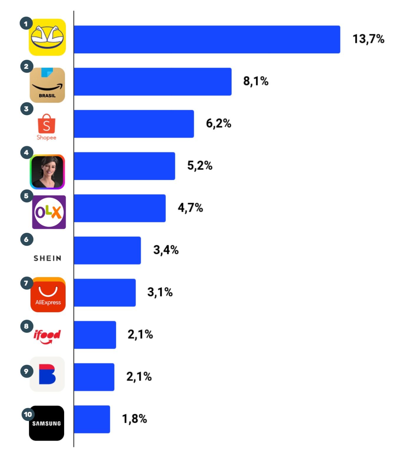 Para as marcas, a oscilação teve pesos diferentes: A Amazon Brasil, por exemplo, passou de 228 milhões de acessos para 194 milhões – uma diferença de 15%. Já o Mercado Livre permaneceu estável (-1%), na casa dos 328 milhões de visitas.