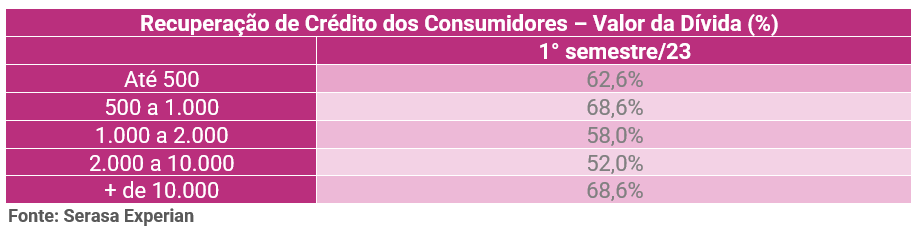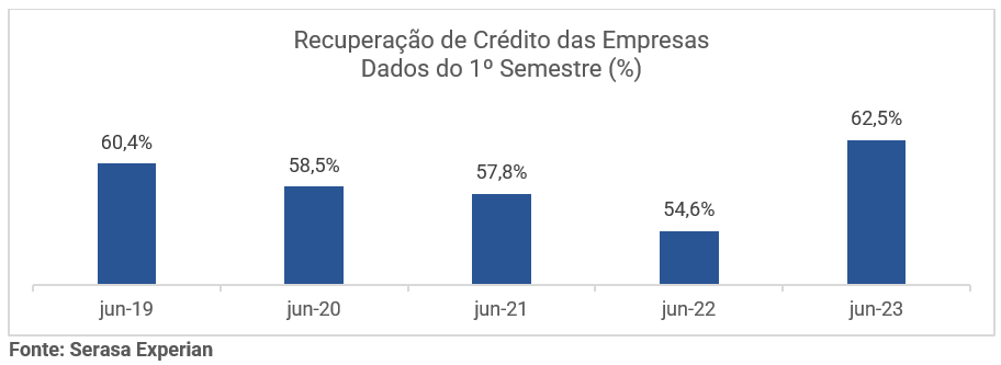 De acordo com o Indicador de Recuperação de Crédito da Serasa Experian, no acumulado de dívidas negativadas no primeiro semestre de 2023, o índice de regularização em até 60 dias após o mês de referência chegou a 62,5%. No recorte por setor, “Bancos e Cartões” recebeu o maior percentual de pagamentos no período (72,4%).