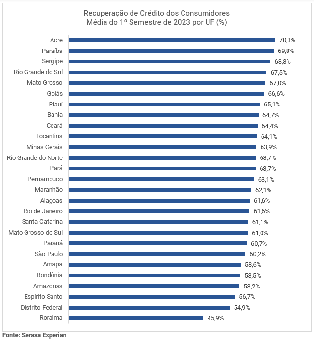 Ainda segundo o Indicador de Recuperação de Crédito da Serasa Experian, no acumulado do primeiro semestre do ano, os consumidores acreanos foram os que mais liquidaram compromissos financeiros em até 60 dias após a negativação. A análise por estado também mostrou Roraima com o menor percentual do país. A seguir está a visão com todas as Unidades Federativas (UFs):
