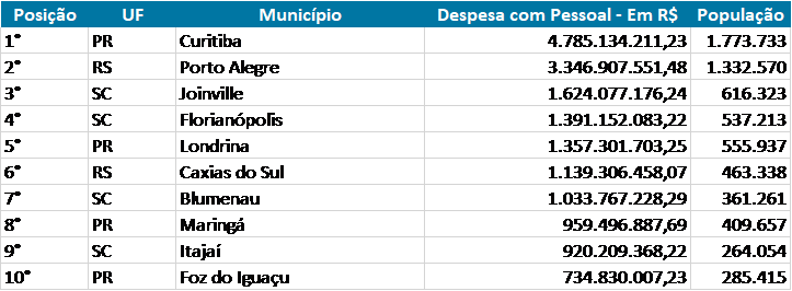 Os custos com pessoal nas prefeituras brasileiras são cerca de 44% de todos os gastos que as administrações possuem, segundo o anuário MultiCidades – Finanças dos Municípios do Brasil. Ao analisar os dados da pesquisa das prefeituras da região Sul do país, verifica-se que Curitiba (PR), Porto Alegre (RS) e Joinville (SC) são os locais com as maiores despesas nesse setor.