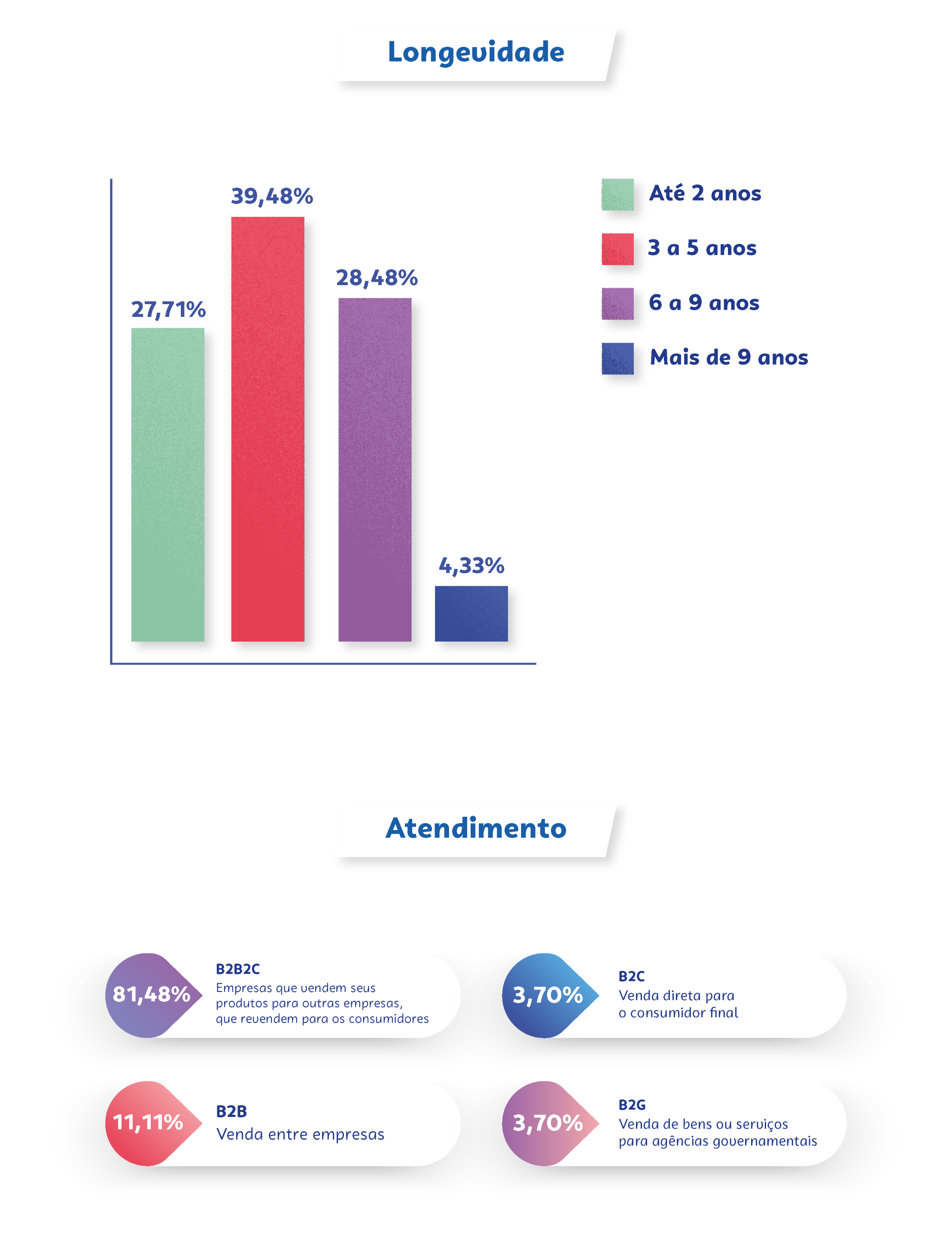 Outro aspecto apontado pelo mapeamento traz informações sobre a faixa etária das startups. Segundo o estudo, 39,48% das startups têm entre três e cinco anos e 28,48% possuem de seis a nove anos. As startups com mais de nove anos representam 4,33% do total. Essa pequena porcentagem sugere que atingir essa longevidade no mercado é uma conquista notável, possivelmente reservada àquelas que alcançam um sucesso excepcional ou que conseguem se adaptar às mudanças de mercado.