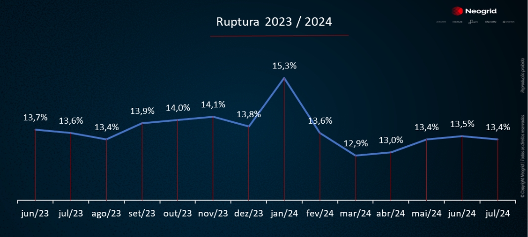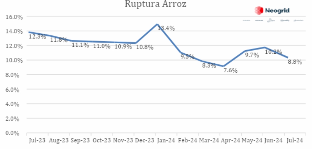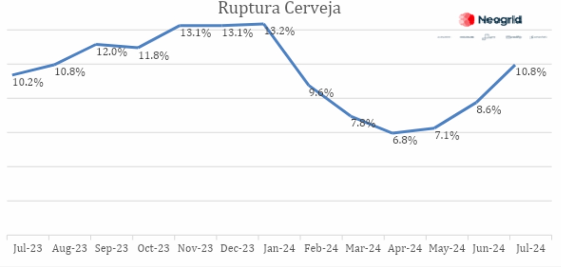 Na lista deste mês, o café continua registrando grandes saltos em termos de ruptura, e segue em subida ininterrupta desse número desde fevereiro de 2024, chegando a ruptura de 11,4% em julho de 2024.