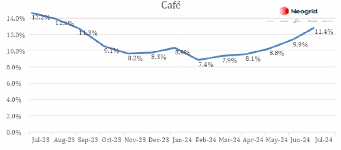 “O café que possui o ciclo de cultivo de mais de 7 meses, e tem a qualidade dos grãos definida ao longo do cultivo sofreram inúmeras variações climáticas ao longo de 2023, que ainda geram reflexos na safra deste ano que são notados por grãos menores e mais leves que diminuem a produtividade por hectare, resultam na elevação do preço e da disponibilidade final no varejo”, afirma Robson Munhoz, diretor de Costumer Success da Neogrid.