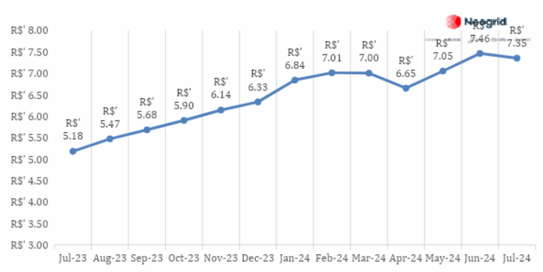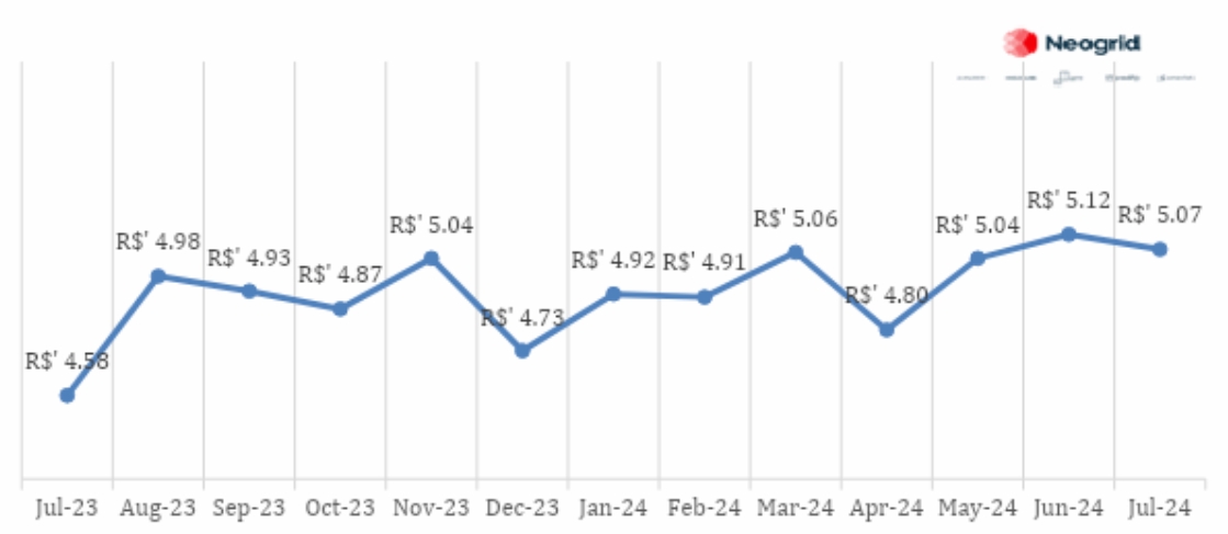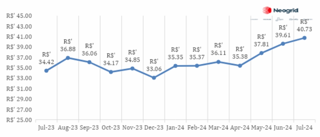 Em julho o preço médio por kg registra redução de -1,5% e em relação ao mesmo período no ano passado registra aumento de 41,9%.