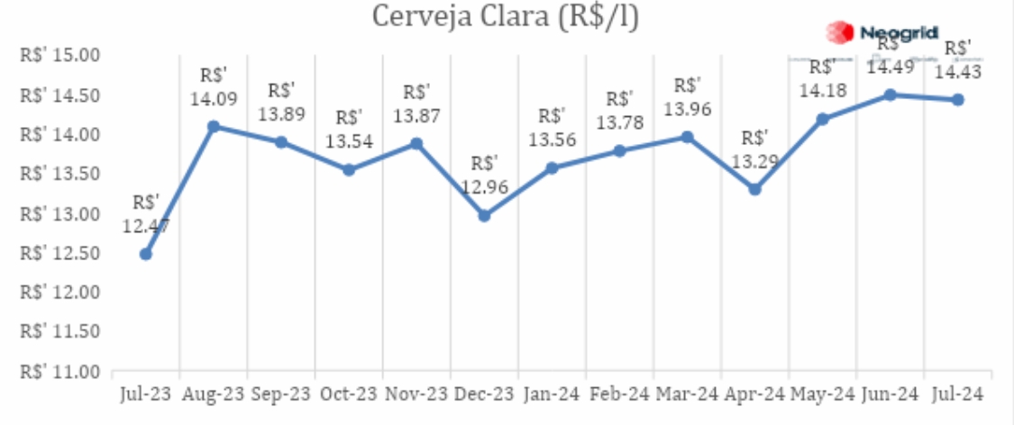 Os preços de Cerveja Clara apresentam estabilidade em julho em relação ao mês anterior no preço por litro. Mas quando comparamos com o mesmo período do ano anterior vemos que o preço da bebida subiu 15,7%.
