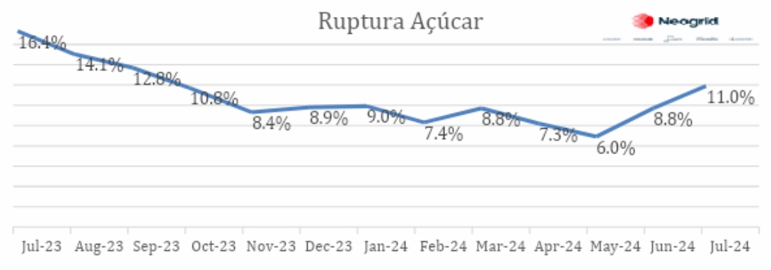O açúcar registrou a maior ruptura no mês de julho em relação a junho saindo de 8,8% (junho) para 11,0% (julho). Já o preço permaneceu estável nos últimos dois meses. De julho de 2023 até agora, o preço do açúcar para o consumidor subiu 10,7% em relação ao mesmo período no ano passado. Esse crescimento no preço está atrelado a demanda aquecida no mercado internacional que pressiona o preço dentro do país.