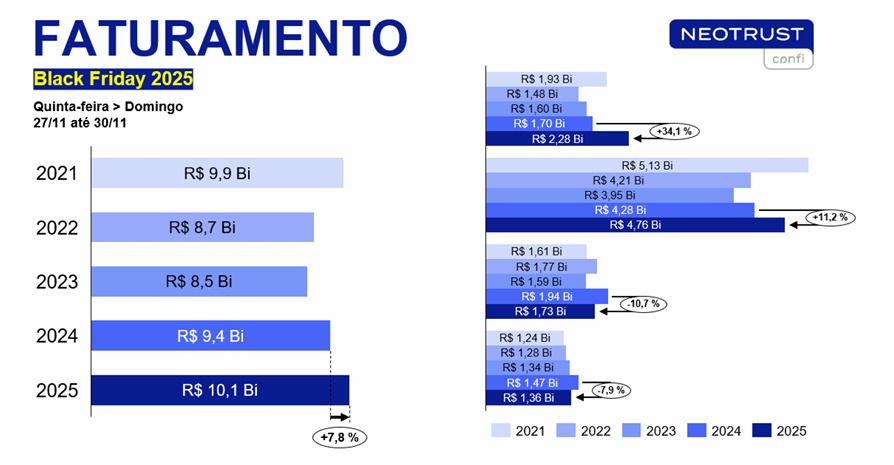 A Confi Neotrust, empresa de inteligência de mercado que monitora o e-commerce brasileiro, divulgou os resultados do acumulado de vendas online realizadas de quinta (27) a domingo (30). O faturamento ultrapassou a marca dos R$ 10,19 bilhões, resultado 7,8% superior ao registrado no período de 28 de novembro a 1º de dezembro de 2024, quinta a domingo da semana de Black Friday do ano passado, quando o total faturado foi de R$ 9,39 bilhões. Os dados foram extraídos da Plataforma Black Friday Hora Hora da Confi Neotrust.