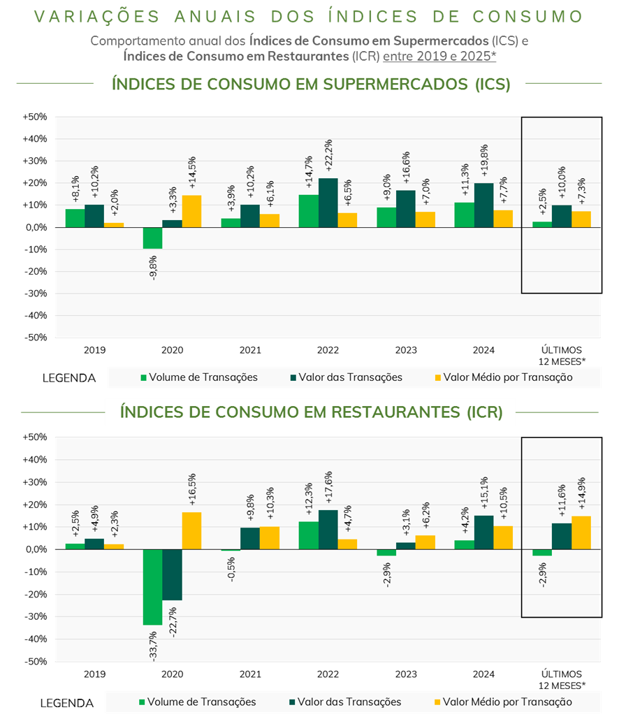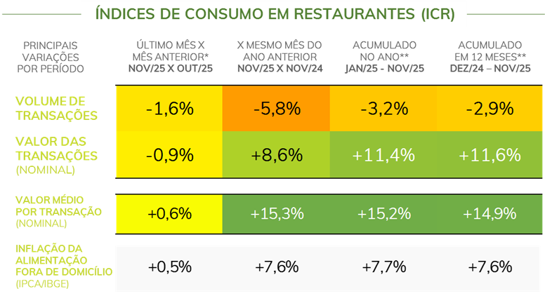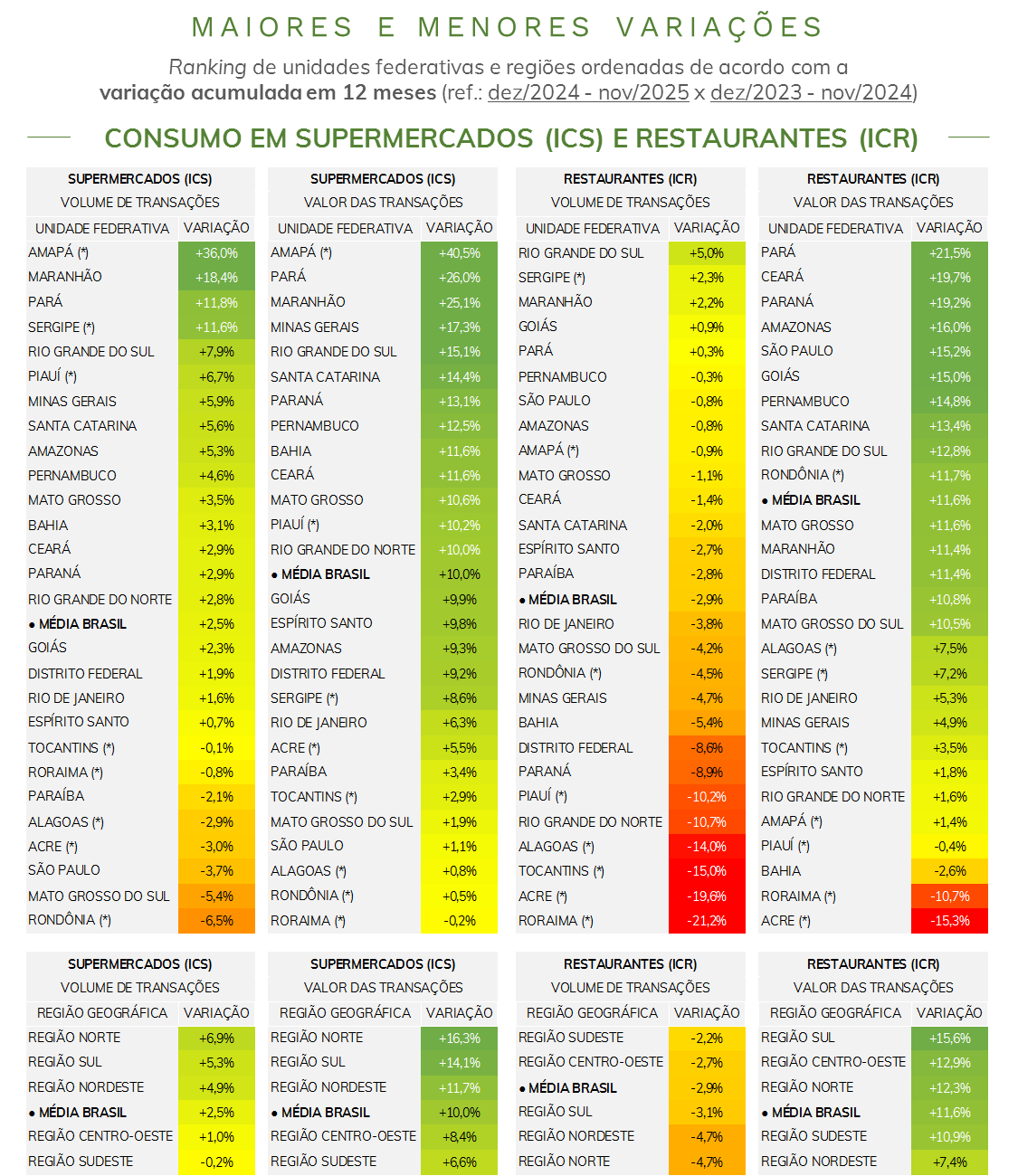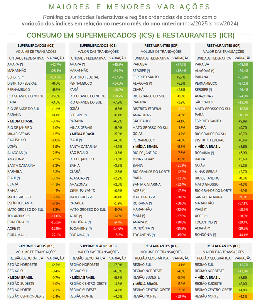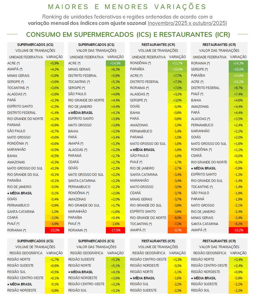 Os índices apontam um viés mais positivo para supermercados do que em restaurantes, com papel relevante do aumento no valor médio por transação. No ICS, a estabilidade do volume (−0,1%) combinada à alta do valor transacionado (+4,1%) e do valor médio por transação (+4,2%) é compatível com um conjunto de fatores que incluem: (inclusive com “esquenta” Black Friday ao longo do mês); mercado de trabalho ainda bastante aquecido e alívio relativo da inflação de alimentos no domicílio em novembro, que pode favorecer volumes físicos/itens por compra, ao mesmo tempo em que o valor por transação sobe por mix (produtos mais caros, itens sazonais) e por “cestas maiores”.