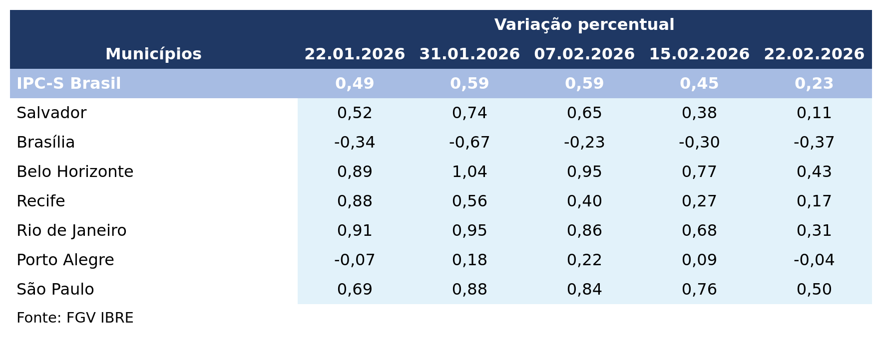 O IPC-S da terceira quadrissemana de fevereiro de 2026 subiu 0,23%, resultado abaixo do registrado na última divulgação. Com este resultado, o indicador acumula variação de 3,61% nos últimos 12 meses.