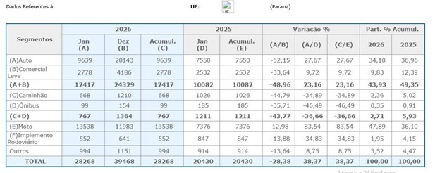 O mercado automotivo do Paraná começou 2026 em forte ritmo de crescimento, ao contrário do verificado na média nacional. Em janeiro, foram emplacados 28.268 veículos no Estado, volume 38,37% superior ao registrado no mesmo mês de 2025, quando foram contabilizadas 20.430 unidades. O desempenho reforça a posição do Paraná entre os mercados mais dinâmicos do país neste início de ano. Na média nacional, as vendas de veículos novos no Brasil caíram 0,38% em janeiro