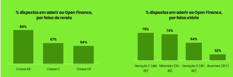 O estudo também concluiu que há uma disposição geral do brasileiro em aderir ao Open Finance, sistema que permite ao consumidor compartilhar seus dados financeiros para acessar produtos e serviços mais vantajosos. O serviço tem aprovação de 80% na classe AB, mas cai para 64% nas classes D e E. Na comparação entre as gerações, 75% da Gen Z e 74% dos Millennials dizem aceitar o Open Finance, enquanto entre os Baby Boomers a taxa é de 52%. Para muitos, esse processo parece técnico, distante e sem benefícios claros. Quando perguntados sobre o que faria com que usassem o serviço, os entrevistados citaram mais segurança e privacidade garantidas, benefícios financeiros e certificações que garantam transparência no uso dos dados.]