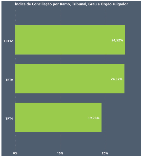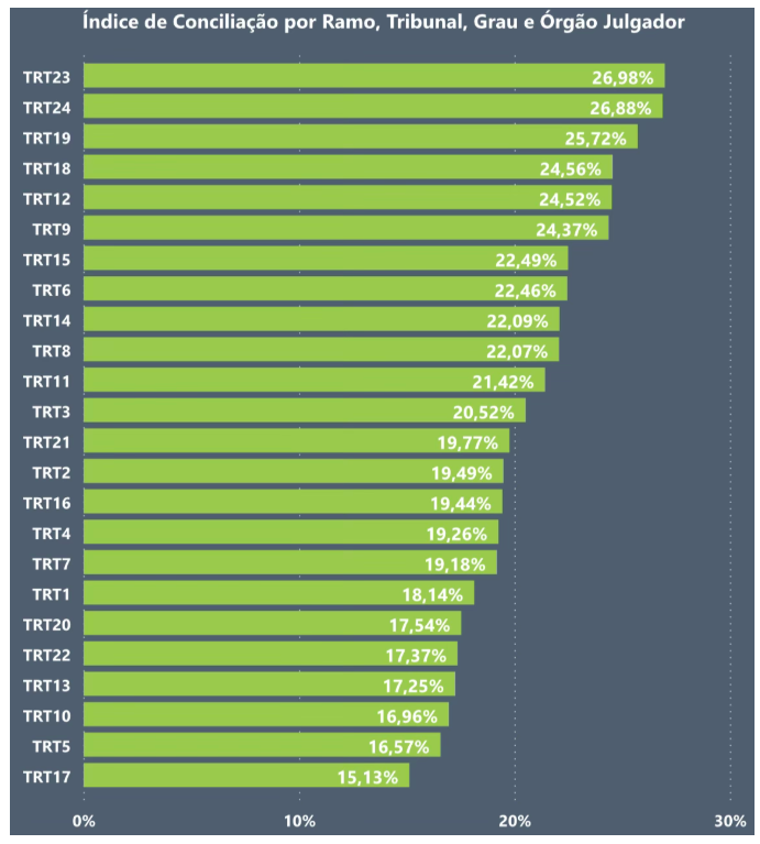 Ainda de acordo com o CNJ, até o final de fevereiro de 2026, os índices de conciliação dos últimos 12 meses entre os tribunais regionais mostram que o destaque foi do TRT12 (Santa Catarina), com 24,52%, seguido pelo TRT9 (Paraná), com 24,37%, e pelo TRT4 (Rio Grande do Sul), com 19,26%. Veja o detalhamento no gráfico abaixo.